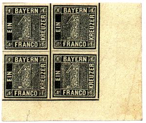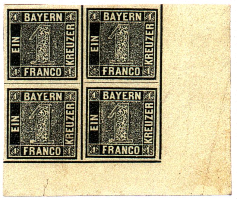 Ausgabe: 1. November 1849 1 Kreuzer grauschwarz bis schwarz Michel 1Ia, Platte 1, geschnitten. Viererblock aus der rechten unteren Bogenecke mit breiten Rändern (20mm), ungestempelt.
