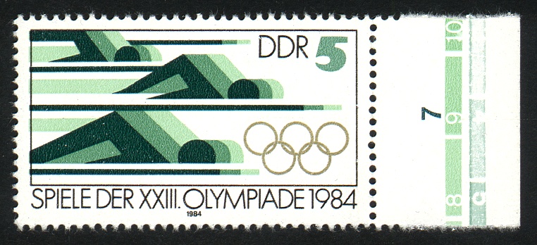 Die DDR-Olympiamarken 1984 Als Reaktion auf den westlichen Boykott der Olympischen Spiele 1980 in Moskau, hatten die Ostblockstaaten ihrerseits die Olympischen Sommerspiele in Los Angeles 1984 boykottiert. Von den insgesamt sechs Marken und ein Block, welche die Postverwaltung der DDR zu diesem Anlaß vorgesehen hatte, waren bereits drei Marken fertig und der Block teilweise gedruckt, als der Boykottbeschluß aus Moskau kam. Somit wurden die Marken nicht ausgegeben ! Da die 1984er Boykottmarken völlig motivgleich
