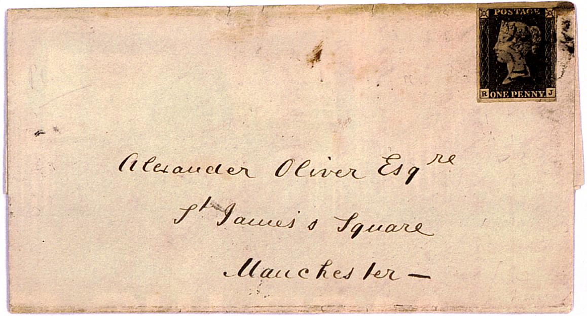 Die 'One Penny Black' auf Brief. England 1840, erste Briefmarke der Welt (Ausgabe am 6. Mai 1840). Abbildung von Königin Viktoria. |