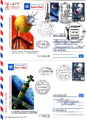 Rückflug zur Erde. Beide frankiert mit der Weltraumbriefmarke "1 Rubel